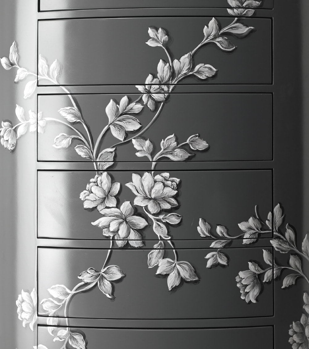 2044 Oval tallboy (F03 with Peonie) cm. 83 x 62 x 154 h. 768/P Armchair (F03 – S269) cm. 84 x 80 x 80 h.