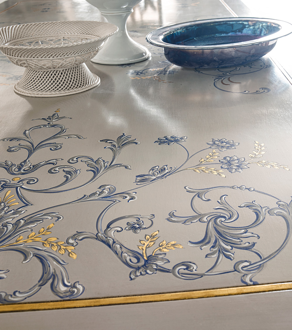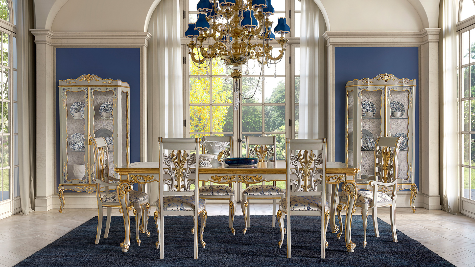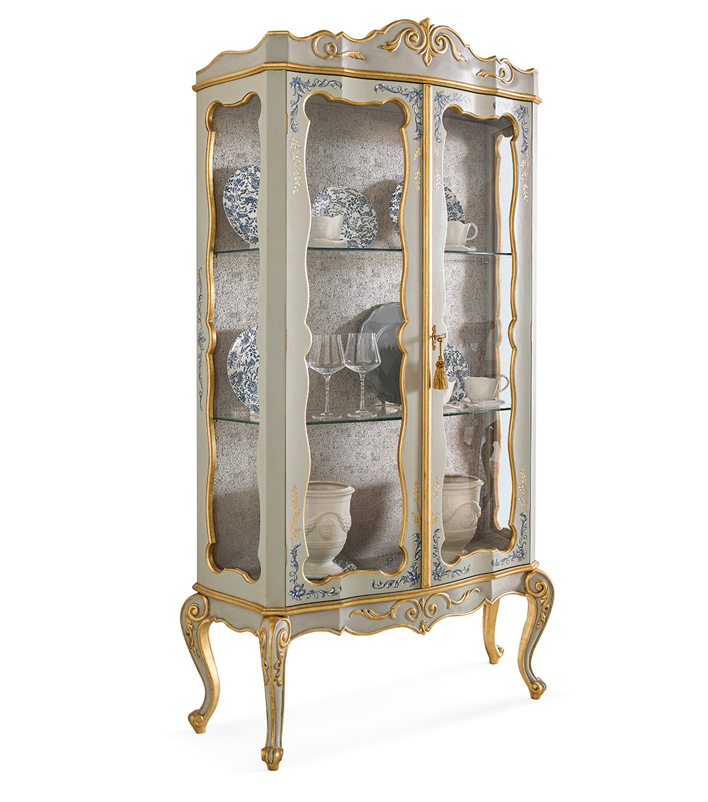 This new display cabinet of the OPERA collection sublimely showcases ANDREA FANFANI®’s fine virtuosity. The hand-painted decorations of the panels cover every area around the glass windows and emphasize their shapes. The feet, proposed in the classic Baroque form, have been embellished with gold foils on the engraved decorations and rear parts. The same type of decoration is present as well on the chairs and the paired table which complete this refined and harmonious interior