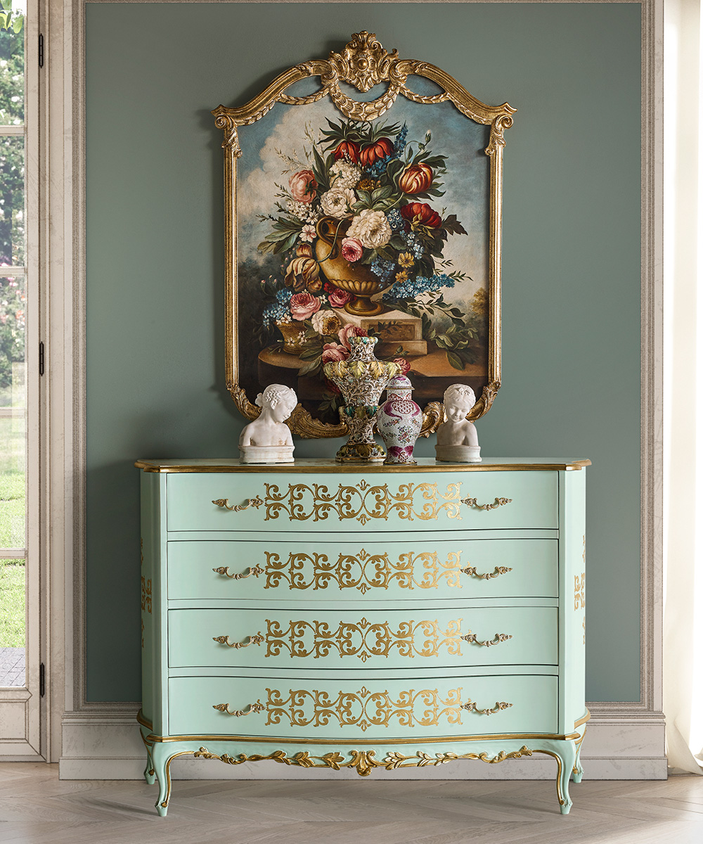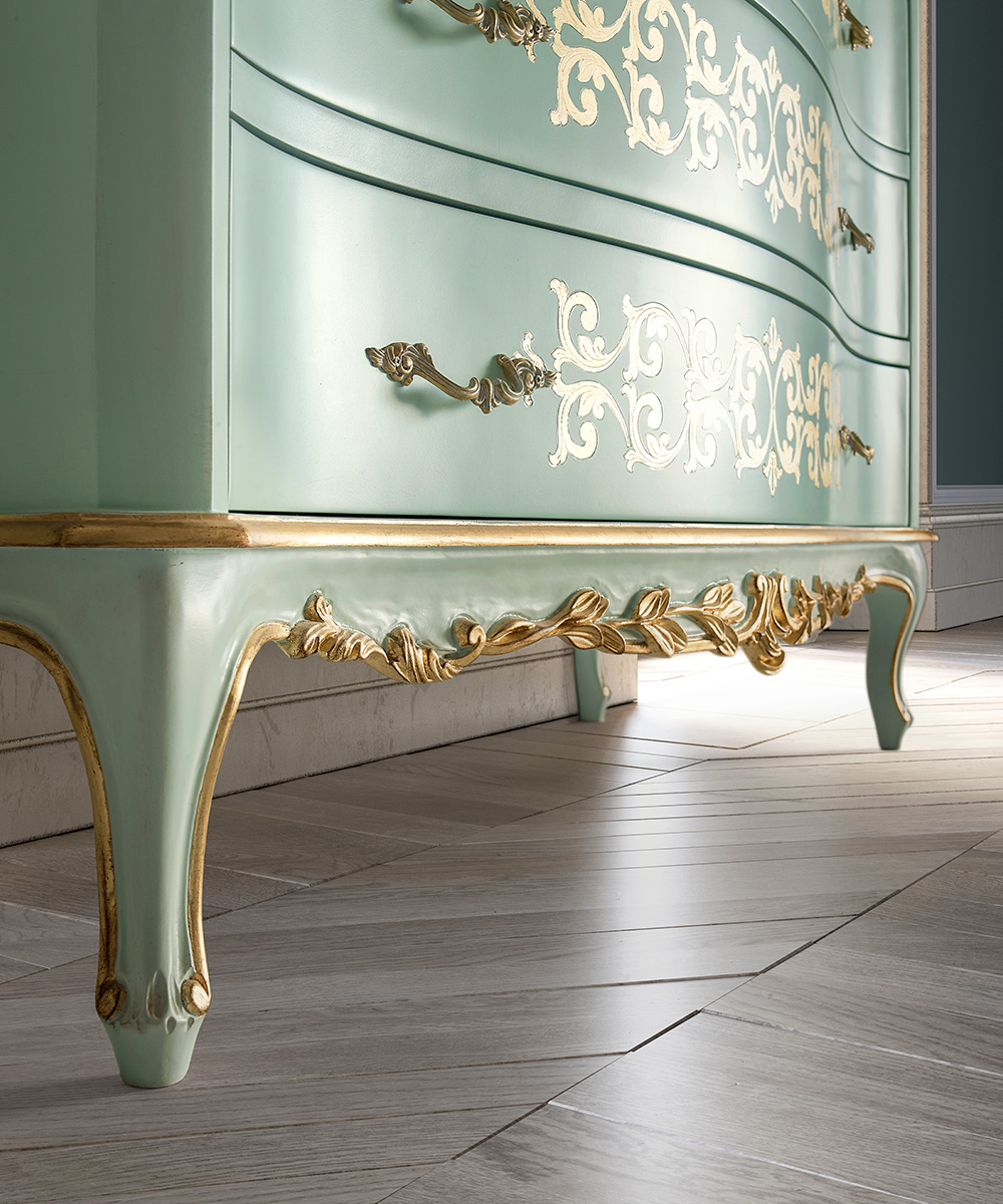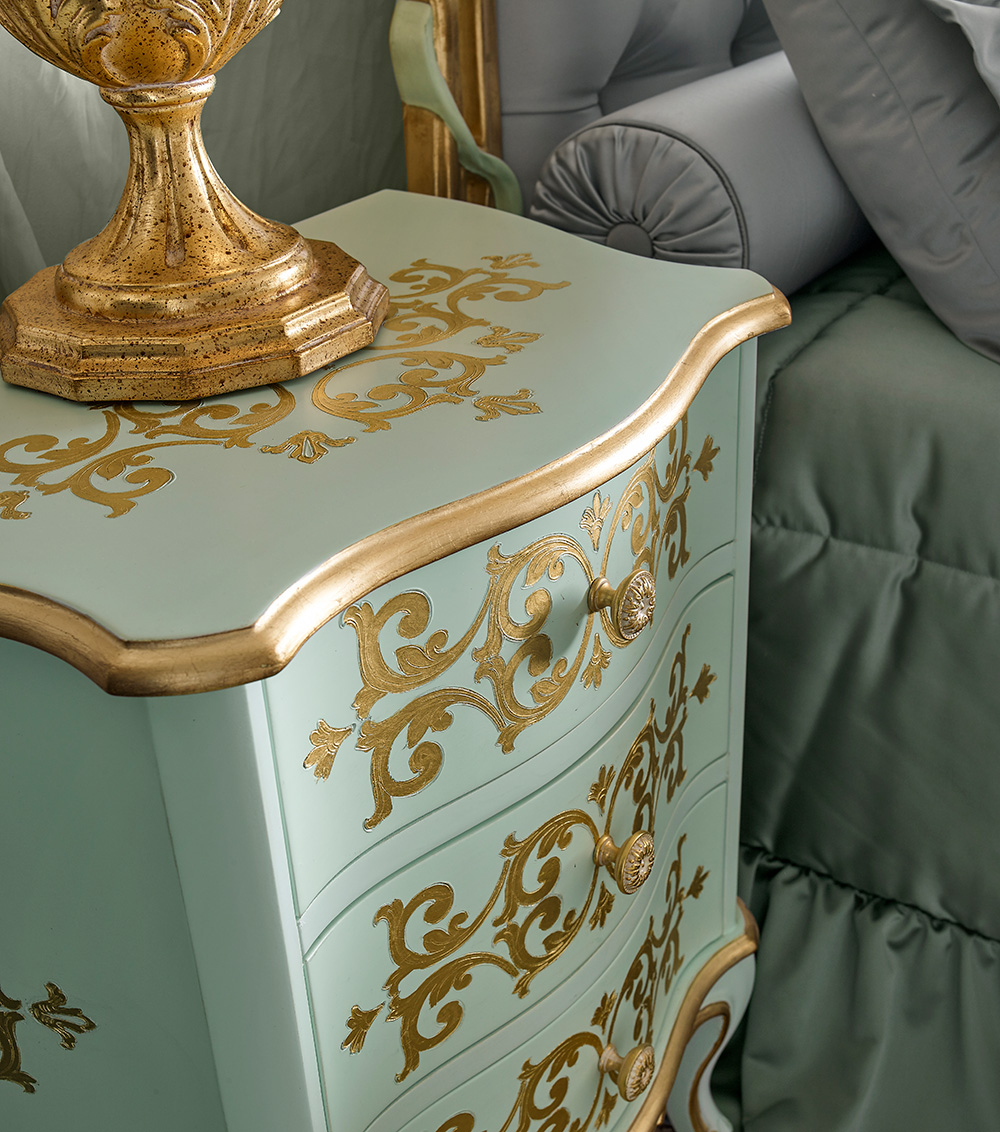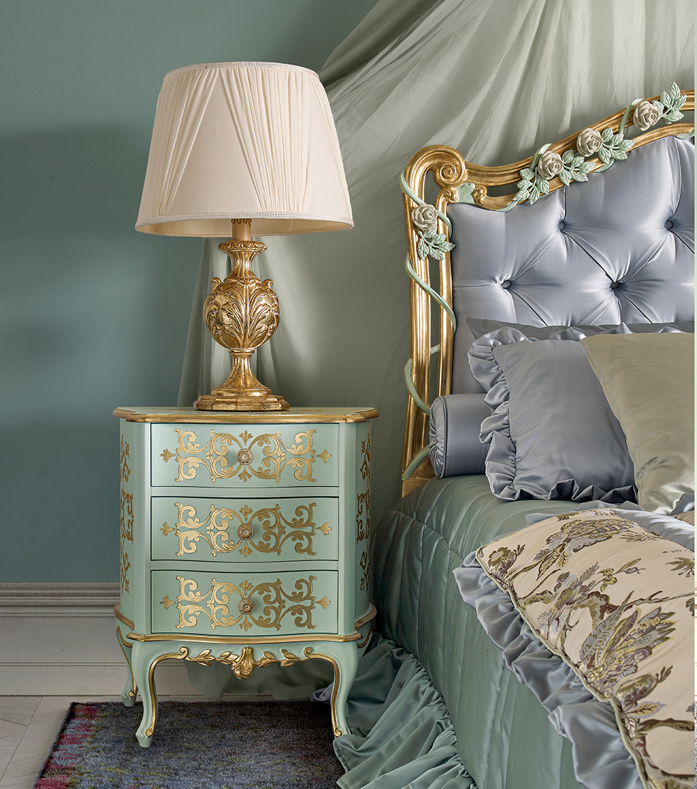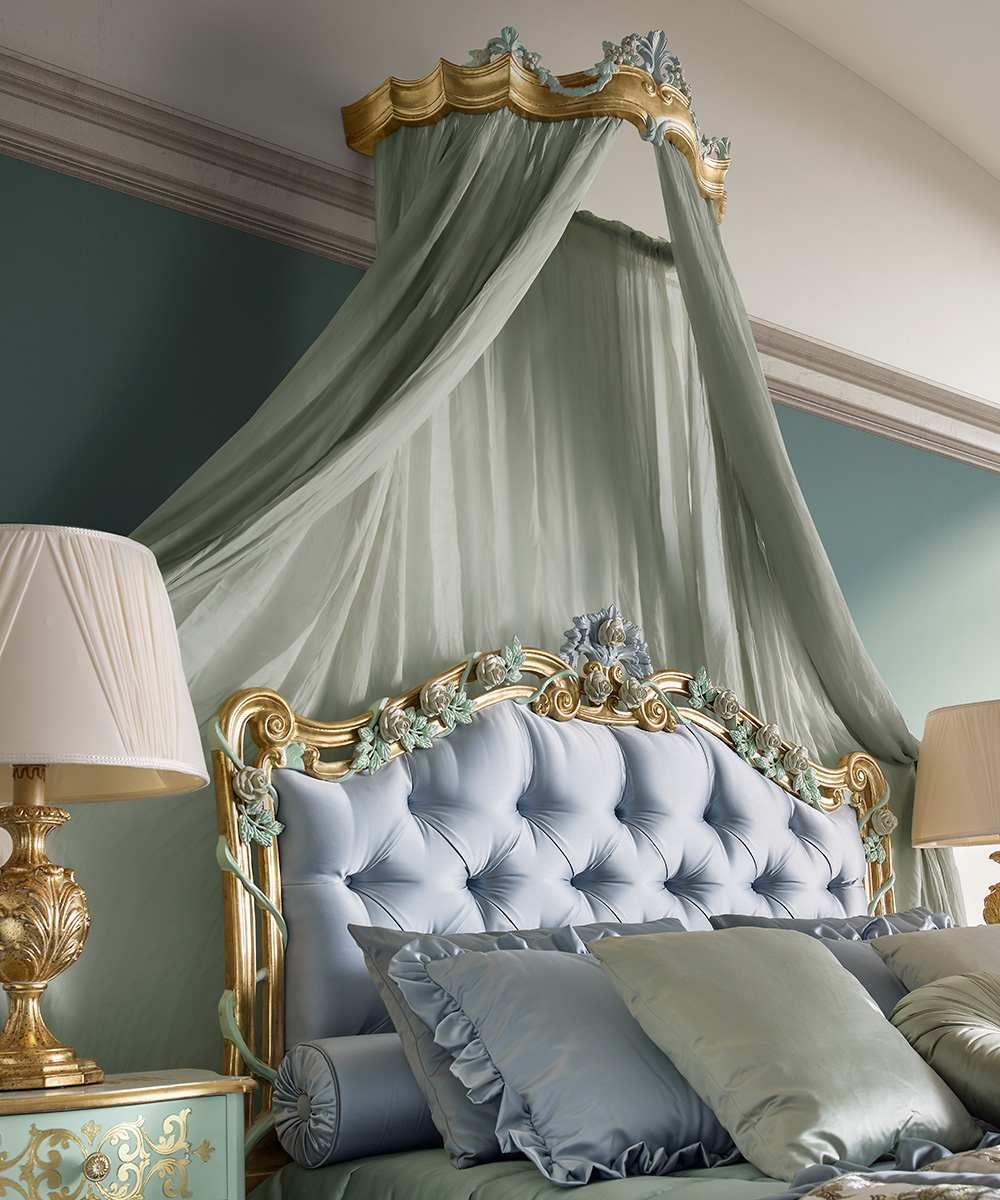 This proposal, for another night area of the OPERA collection, covers an entire, rich interior. The decoration of the bed’s headboard tastefully melts with the flowery carvings and the gold finish.