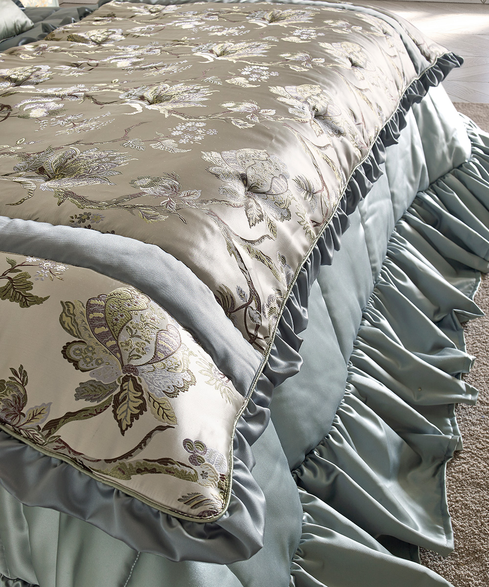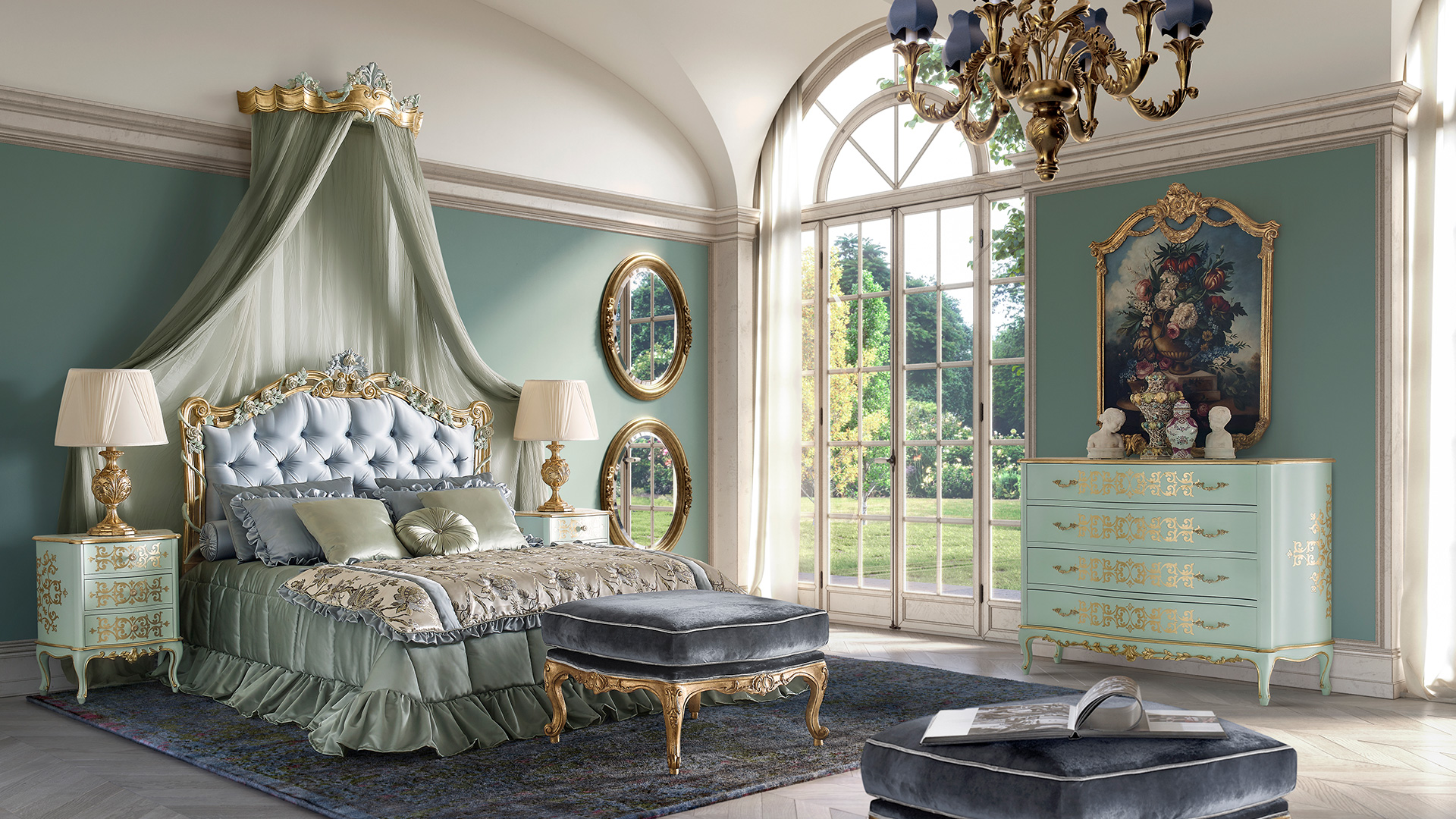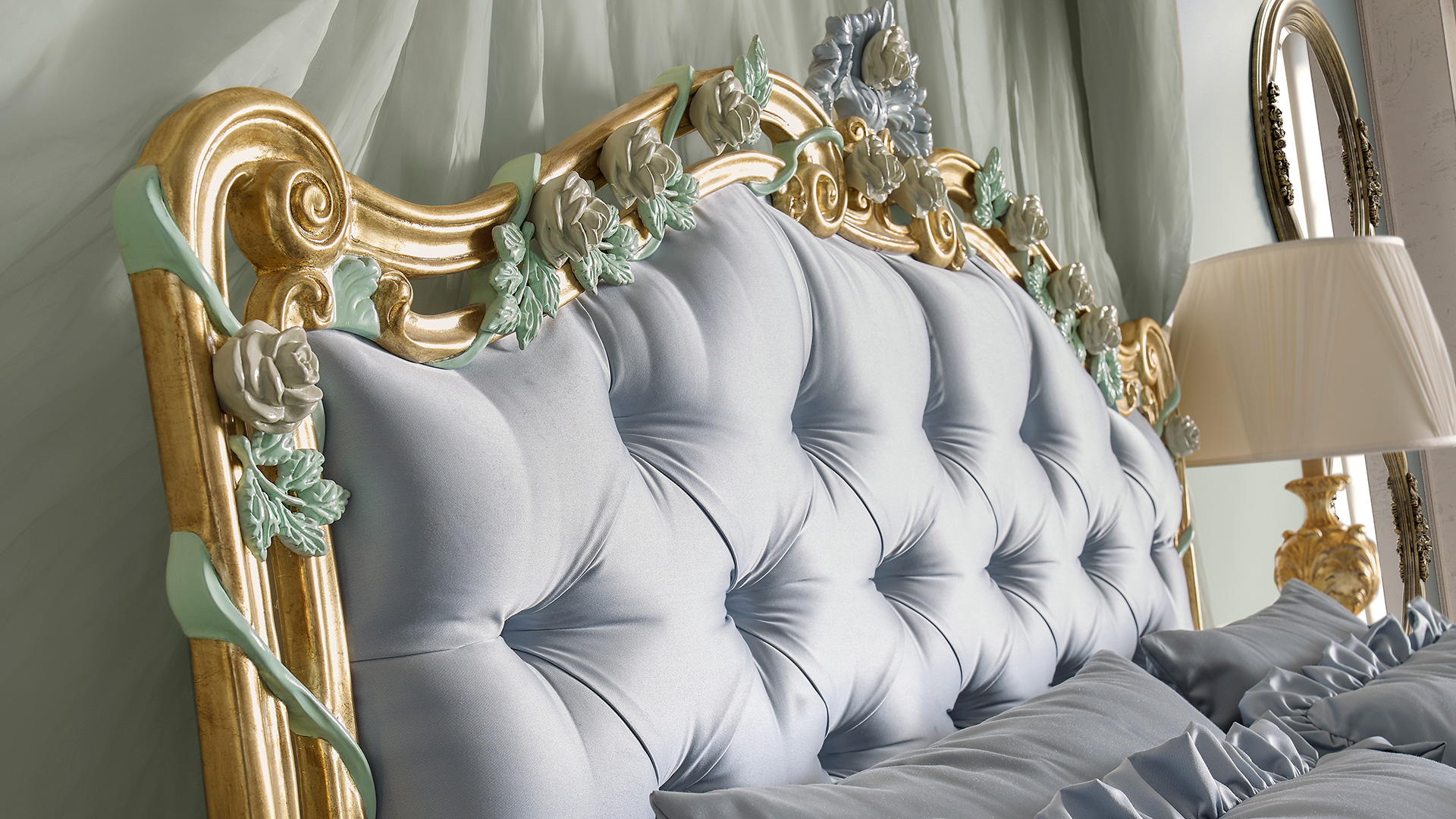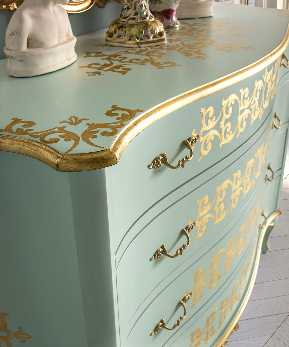 This proposal, for another night area of the OPERA collection, covers an entire, rich interior. The decoration of the bed’s headboard tastefully melts with the flowery carvings and the gold finish.
