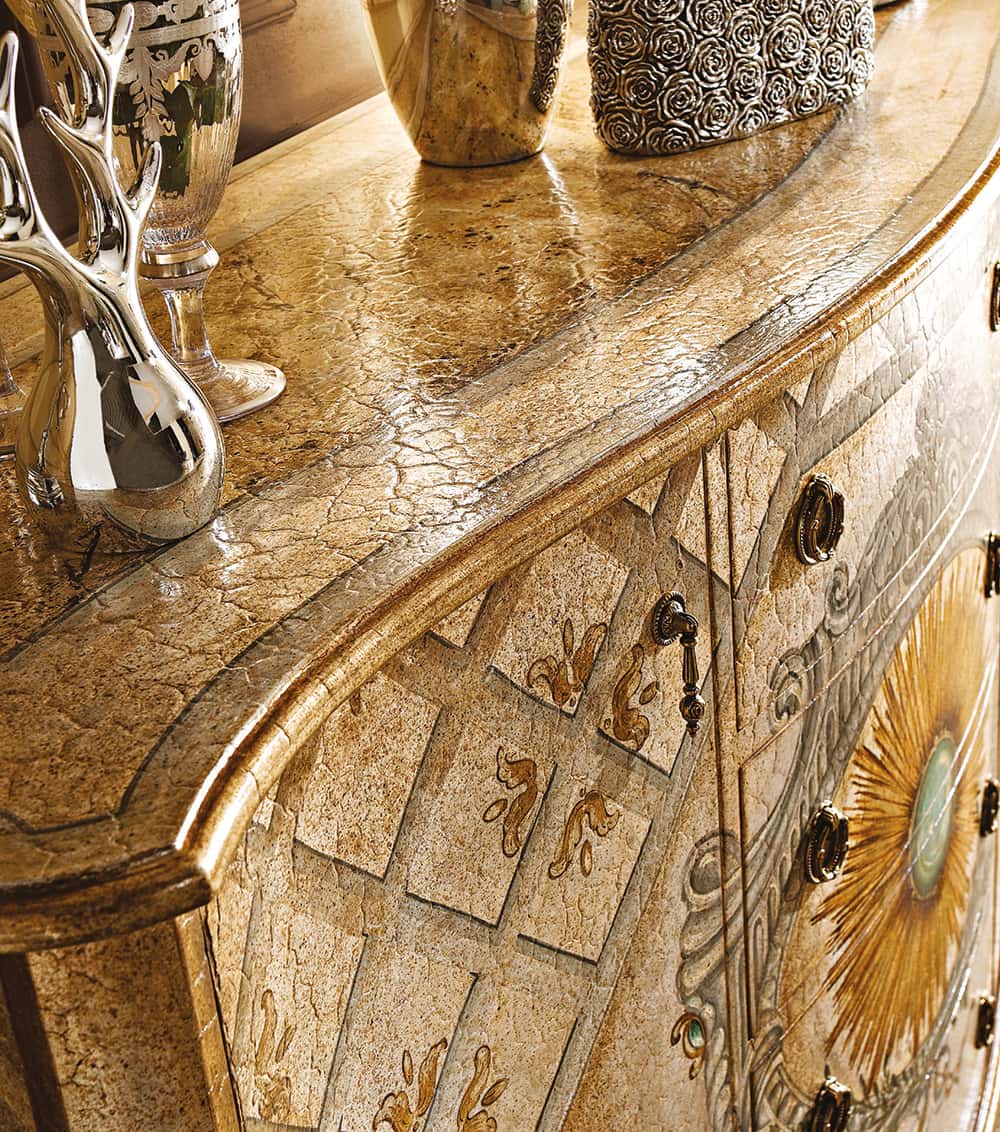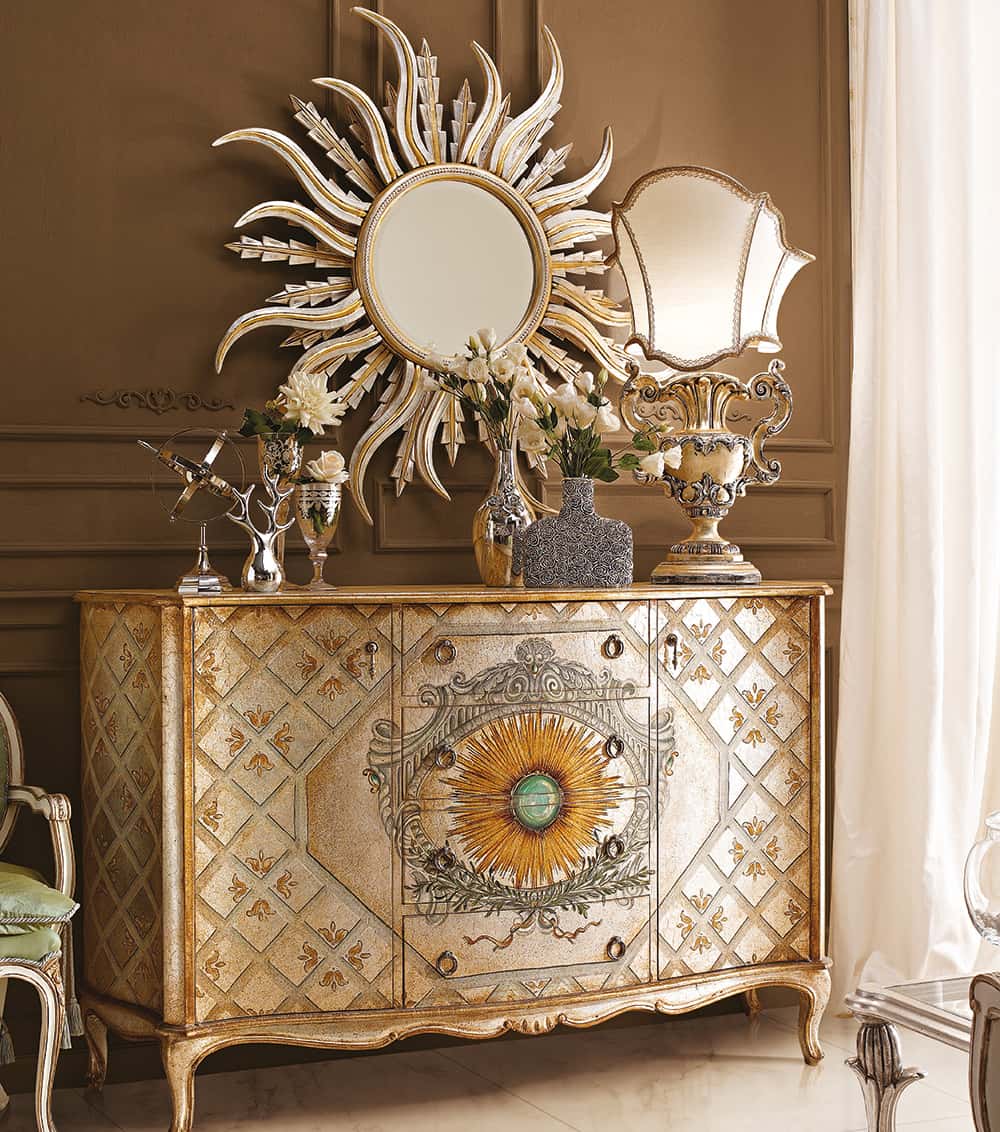 2020 “Sun” sideboard cm. 170 x 54 x 110 h. 952 Trophy table lamp (L28) cm. 50 x 92 h. 1113/G “Sun” mirror (L13) cm. ø 122