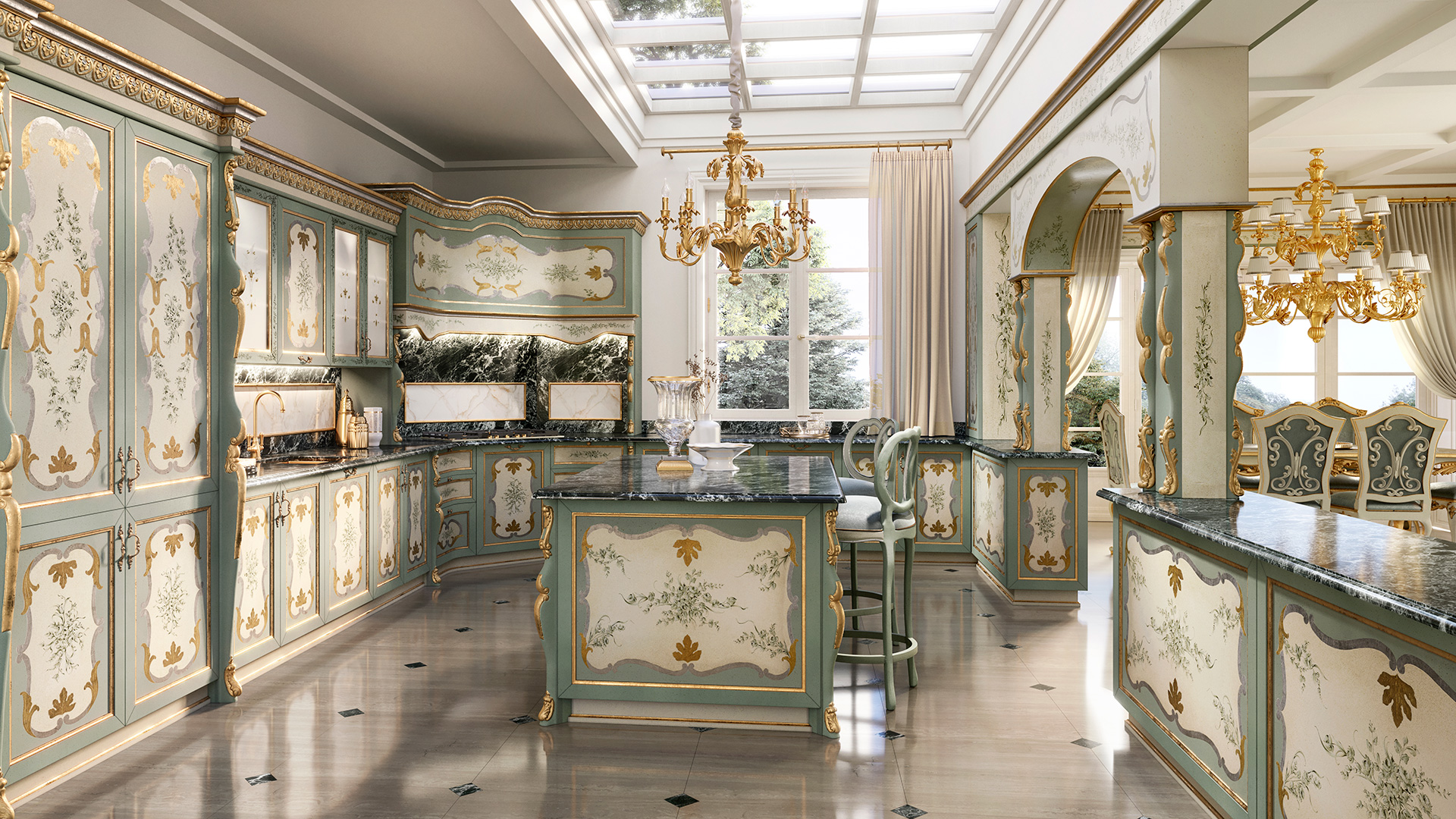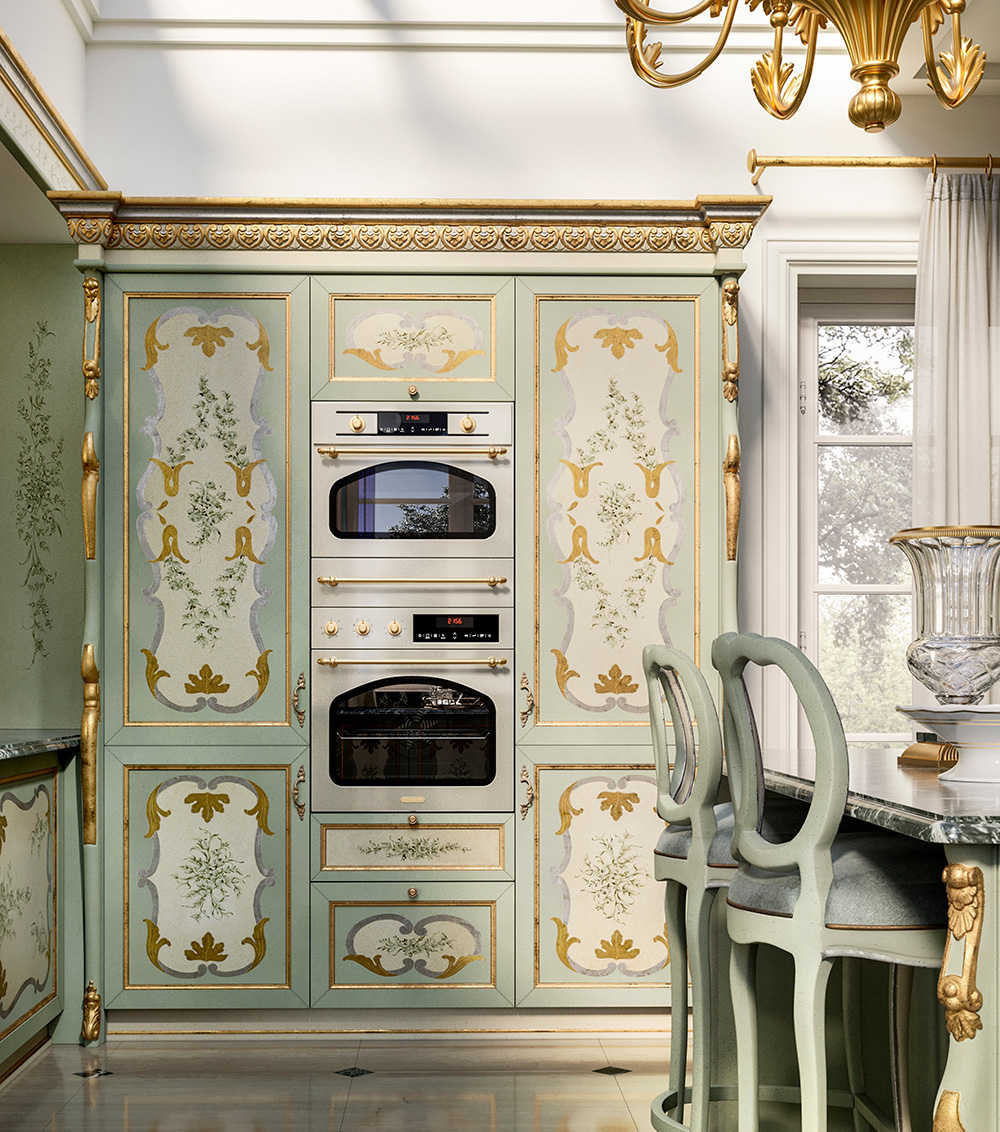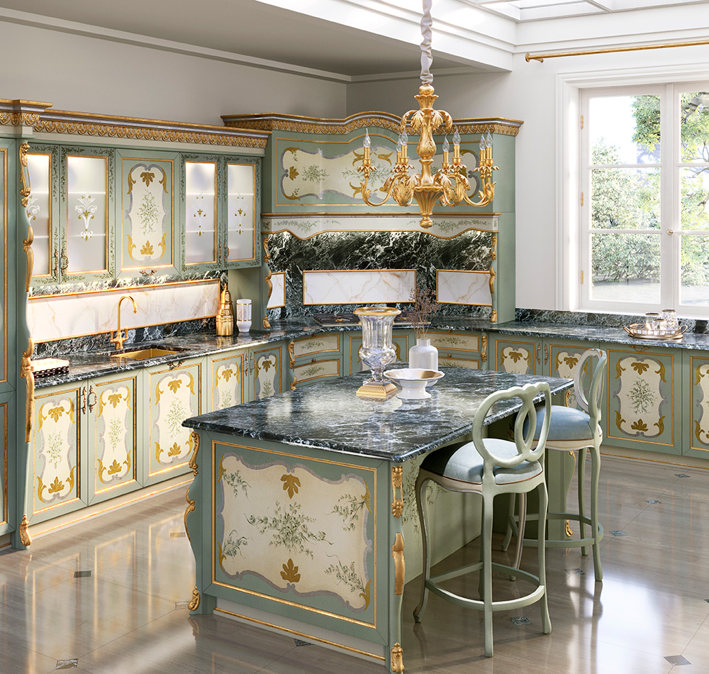 Every decoration of the kitchens of the OPERA collection celebrates the traditional Venetian style. Refined lines and the quality of the precious woods used create suggestive interiors in which functionality meets pure beauty. Harmony in colours and forms stands out and creates a unique, ethereal atmosphere without, however, omitting the importance of cutting-edge technology accessories and components.